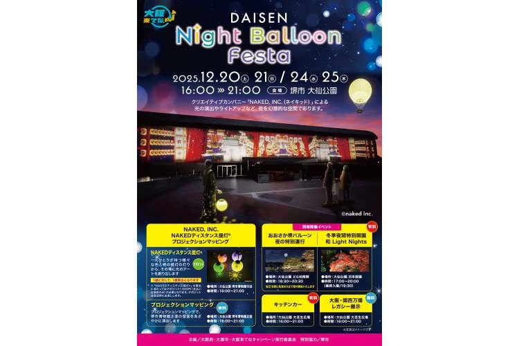 「DAISEN Night Balloon Festa」は、京都・二条城や平安神宮のイルミネーション演出などをはじめ内外で活躍している大阪府出身の村松亮太郎氏が率いるクリエイティブカンパニーNAKED, INC.(ネイキッド)による華やかなプロジェクションマッピングを見ながら、食も楽しめるイベントで、同公園日本庭園が実施する「冬季夜間特別開園 和 Light Nights」(主催:堺市/URL:https://www.daisenteien.jp/event/tw2wj5c1lke1)に合わせて開催します。