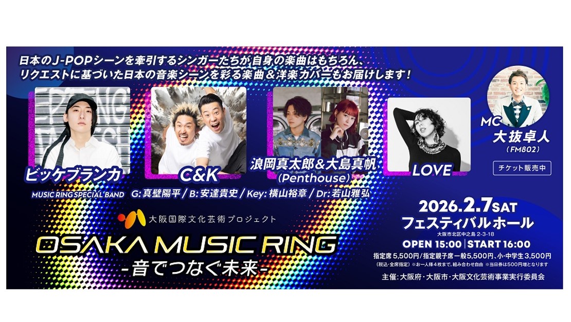 フェスティバルホールにて ビッケブランカ、C&K、浪岡真太郎&大島真帆(Penthouse)など豪華ゲストが未来へ残していきたい名曲の数々を次世代へとつなげるコンサートを開催します。