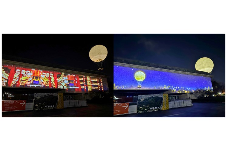 堺市博物館正面の壁面には「DAISEN Night Ballon Festa Welcome Mapping」と「SAKAI NIGHT MUSEUM」の2種類のコンテンツが上映され、来場者を幻想的な世界へと誘いました。