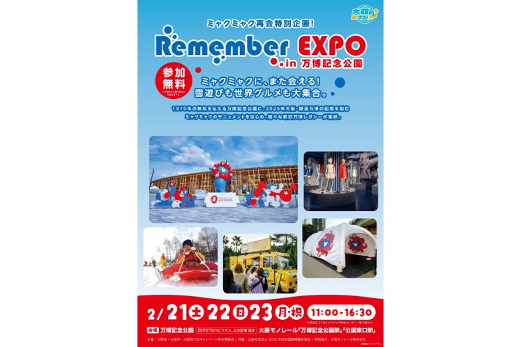 2월 21일(토), 22일(일), 23일(월, 공휴일) 3일간 일본 만국박람회(1970년 오사카 만국박람회) 개최지였던 만국박람회 기념공원(오사카부 스이타시)에서 'Remember EXPO in 만국박람회 기념공원'을 개최한다.